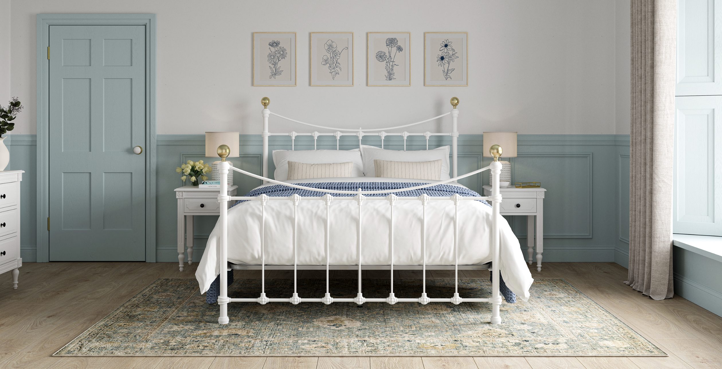 Create a haven that exudes sophistication with the classic Arabella metal bed frame. Meticulously crafted with intricate mouldings, Arabella’s monochromatic tones are beautifully offset by shining brass finials at each corner. This bed frame is finished with supportive sprung slats, creating a cushioned and durable foundation for your mattress. Intricately carved ornate metal bed Powder coated paint finish Contrasting brass finials Available in sizes double to super king Wooden sprung mattress support