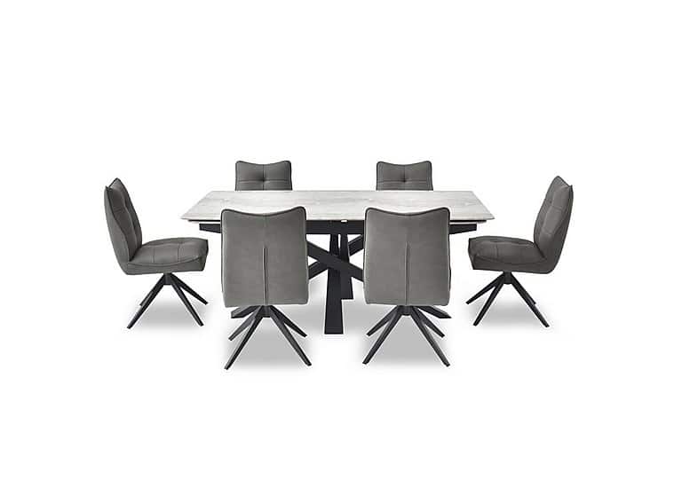 In this great- value dining set, our exclusive Germain range brings together two of our favourite finishes – luxurious high- gloss marble and industrial black metal. Why you’ll love it Luxurious marble style with a cool industrial aesthetic at a great- value price. The perfect combination of sleek opulence and everyday durability. This dining set features a boat- shaped extending dining table. High- gloss top is made from solid marble finished with marbled patterning. Slender black metal legs have a powder- coated finish. Smooth draw leaf mechanism extends this table in seconds. A flawless finish – the extension leaves perfectly match the table top pattern. Available in 2 sizes. Dining set includes 6 inviting dining chairs. Chairs have pocket spring seats with sumptuous cushioning. On- trend stitching and buttoning detail. Swivel base with black powder- coated metal legs. In a choice of upholstery colours. Only at Furniture Village. This dining set is part of our Germain range. What you need to know Chairs have metal frames and legs and are cushioned with foam. Dining table has a marble top and metal legs. Small 150 cm dining table seats 6 closed and 8 when extended. Large 180 cm dining table seats 8 closed and 10 when extended. Marble is hardwearing but not indestructible, so it’s important to care for it properly. Spillages need to be removed immediately. To clean, wipe gently with a damp cloth using warm water, then buff dry. We recommend that you use coasters and placemats to protect against heat and moisture. Do not use knives to cut food on a marble table top, use as a work top, place heavy weights on the table or use acidic or abrasive cleaners. You should never sit or stand on a marble surface. For more advice on caring for your marble furniture, see ourDining care guide.