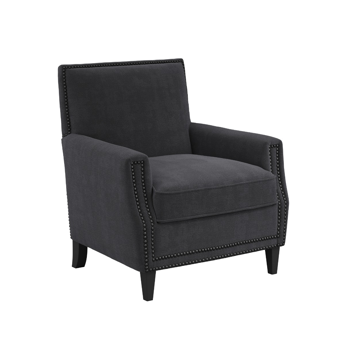 LPD Atticus Anthracite Chair The LPD Atticus Anthracite Chair exudes timeless sophistication and comfort, making it a perfect addition to any living room or study. Upholstered in a rich anthracite fabric, this armchair combines classic design elements with a modern twist. The sleek, angular frame is complemented by elegant nailhead trim that outlines the chair s arms and back, adding a refined detail to its overall appearance. The chair features a generously cushioned seat and backrest, providing comfort and support for extended seating. Its sturdy wooden legs offer stability while blending seamlessly with the chair s sophisticated design. Key Features: Upholstered in luxurious anthracite fabric Classic nailhead trim detailing for added elegance Generously padded seat and backrest for optimal comfort Sturdy wooden legs for stability and durability Ideal for classic, modern, or transitional interiors The LPD Atticus Anthracite Chair is a stylish yet comfortable seating option that brings both charm and functionality to any room, making it a perfect choice for those looking to elevate their home decor.