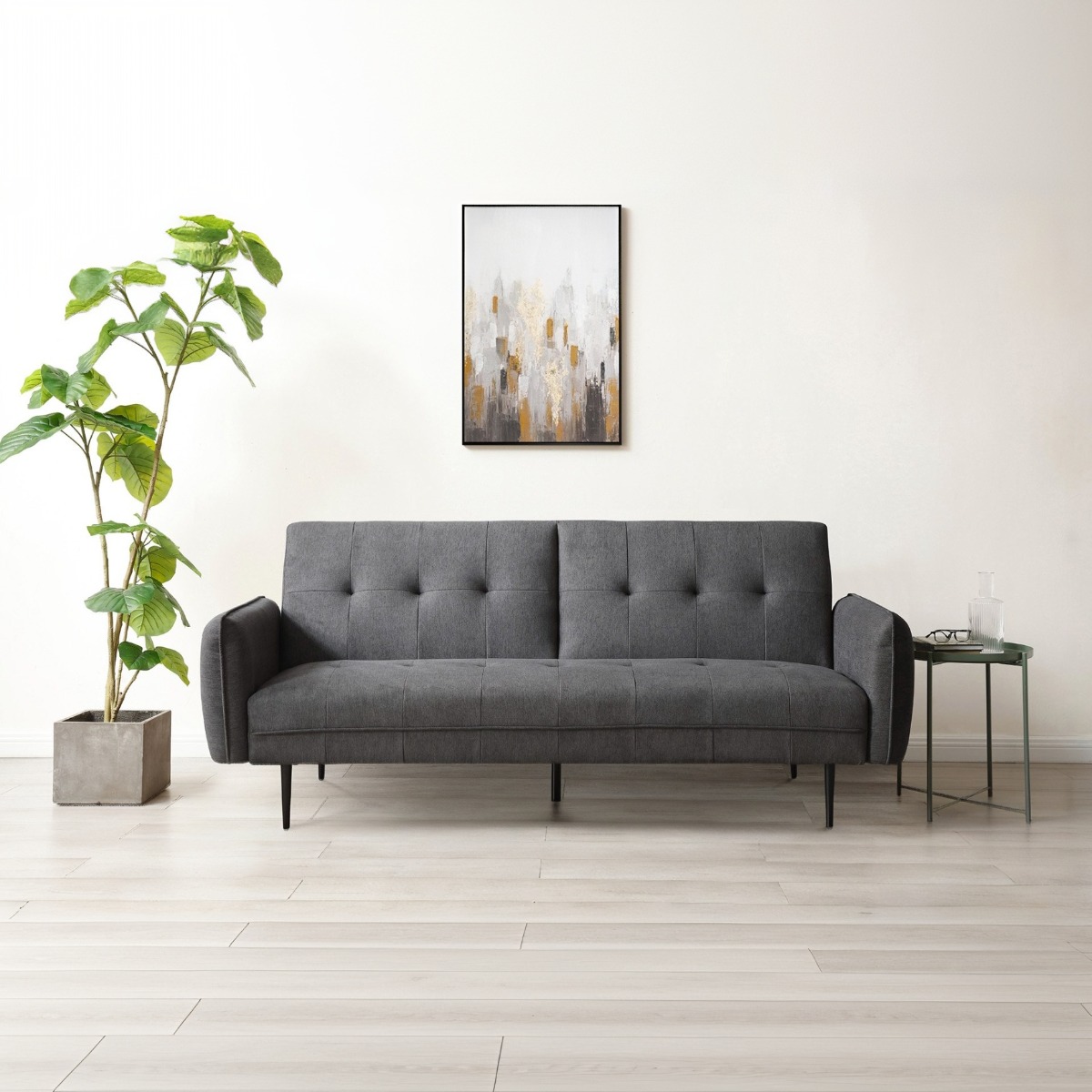Rosside Sofa Bed Unfold both style and functionality with the Rosside Sofa Bed. This versatile piece seamlessly transforms from a chic sofa to a comfy sleeping space, making it ideal for small flats, guest rooms, or any space where maximising functionality is key. Rosside boasts a timeless design with tufted detailing on the back and seat, accentuated by elegant piping. Choose from three beautiful Soft Textured Weave colours – Themis Grey, a calming hue; Themis Blue , a pop of vibrancy; or Themis Orange , a touch of sunshine – to perfectly complement your d cor. Built for comfort and durability, the Rosside features a plush, supportive feel and sturdy black legs that provide a sleek, modern foundation. The convenient Click-Clack mechanism allows for effortless conversion from an upright sofa to a relaxed lounger or a lay-flat bed, perfect for movie nights or accommodating overnight guests. Rosside is the perfect solution for modern living. It offers exceptional comfort, undeniable style, and ultimate versatility, transforming your space into a functional and inviting haven. Relax in style, sleep soundly. Click and transform your space with the Rosside Sofa Bed today! Dimensions: (H)88cm x (W)210cm x (D)91cm Sleeping Dimensions: (W)110cm x (L)180cm