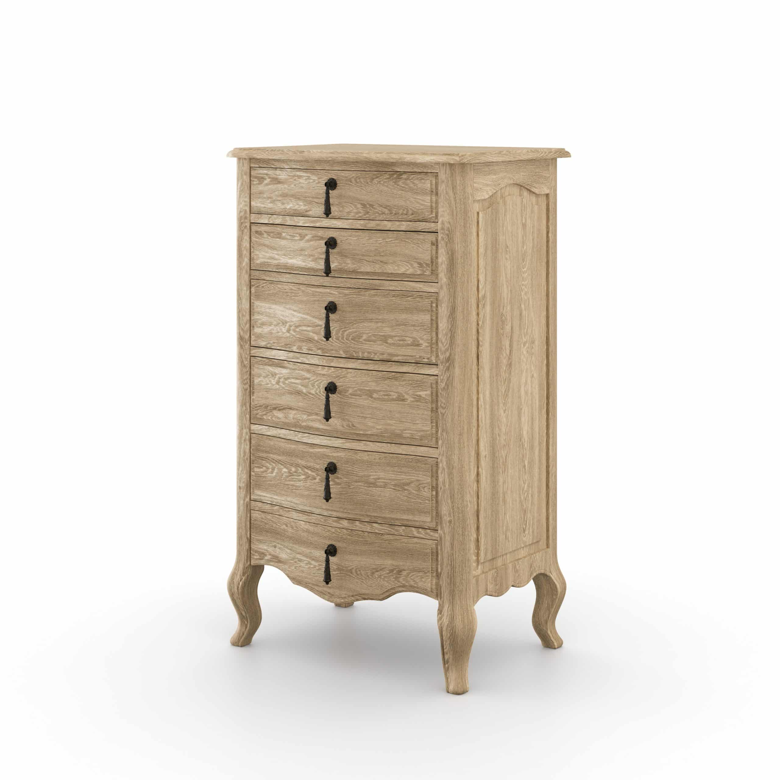 This versatile and timeless piece pairs perfectly with any of the iconic Salcombe range or makes a charming addition to a variety of spaces in your home. Ornate hinged metal drop handles front all 6 flush closing drawers, which vary in depth for optimum storage space. With a gently domed front, the Salcombe Tallboy has a sweeping finish with a nod to French opulence throughout. View In-Store Crafted from pale weathered oak 6 spacious drawers in a variety of depths Ornate hinged metal drop handles Elegant curved front design for a romantic finish Due to the handcrafted nature of the weathered oak finish, no two pieces will be identical Part of our Salcombe collection