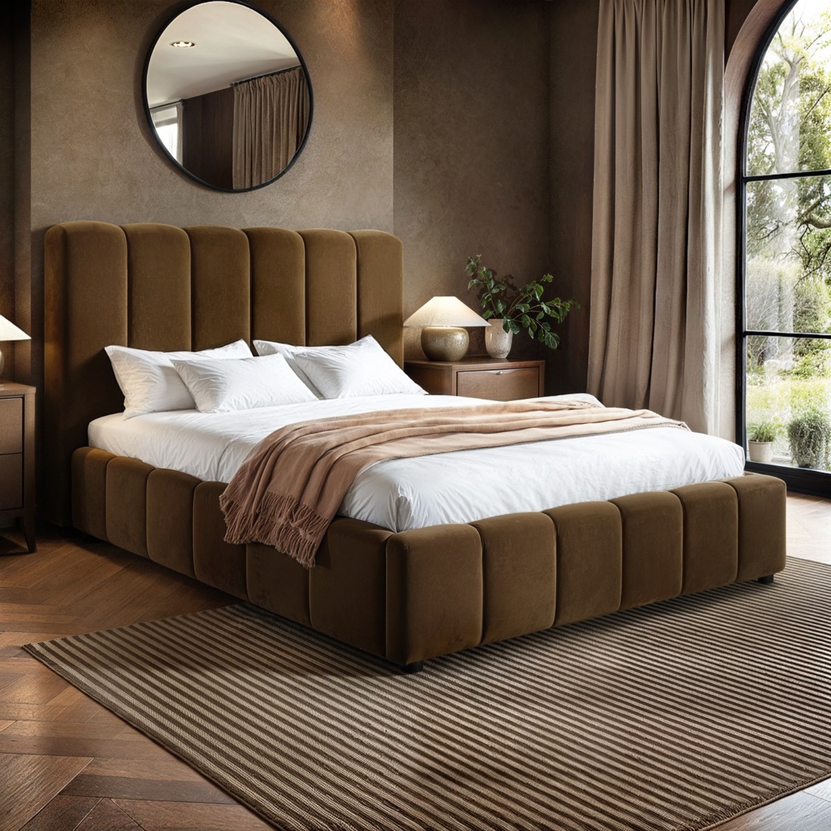 Solace+Co Emilie Ribbed Ottoman Bed Brown Velvet Make a statement in your bedroom with the Solace+Co Emilie Ribbed Ottoman Bed. Upholstered in luxurious plush velvet or textured boucle, this bed features a striking tall, scalloped headboard with bold vertical panel detailing. The fully padded frame ensures comfort and safety, while the earthy, neutral tones blend with any interior. The built-in ottoman base lifts easily to reveal spacious hidden storage, perfect for keeping your bedroom tidy. Key Features: Plush velvet or boucle upholstery – for a luxurious look and feel Scalloped tall headboard – with bold vertical panels for a standout design Integrated ottoman storage – for extra bedding, clothes, or essentials 4 Colour Options – Mocha Velvet, Brown Velvet, Green Velvet and Cream Boucle Specifications: Material: Upholstered frame with solid wood slat base Weight Capacity: Max 260kg Footend height: 32cm Double Bed: Overall Dimensions: L216 x W158 x H114 cm Internal Dimensions: 152 x 202 cm Product Weight: 72.5kg King Size Bed: Overall Dimensions: L226 x W173 x H114 cm Internal Dimensions: 137 x 192 cm Product Weight: 94kg