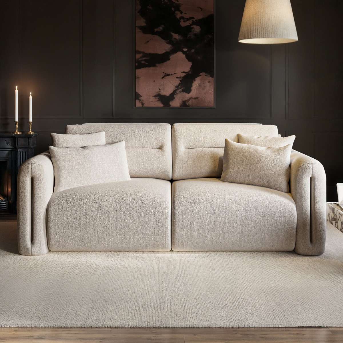 Solace+Co Mabel 3 Seater Sofa Beige Chenille The Mabel 3 Seater Sofa in Beige Chenille is a blend of modern design and plush comfort. Upholstered in a luxurious beige chenille, this piece brings contemporary touch to any living room. With its sculptural silhouette, statement arms, and supportive foam-filled cushions, the Mabel offers style and comfort. Key Features: Luxurious beige chenille upholstery for a soft finish Contemporary design with sculpted, statement arms Includes two matching accessory cushions for added comfort and style Foam-filled seat and back for lasting support No assembly required, and ready to enjoy straight away Specifications: Dimensions: W211cm x D93cm x H80cm Seat Height: 43cm Seat Depth: 58cm Internal Width: 173cm Arm Height: 63cm Weight: 52kg Filling Type: Foam Frame Material: Eucalyptus wood, strong plywood Packed Dimensions: W214cm x D96cm x H66.5cm Packed Weight: 61kg