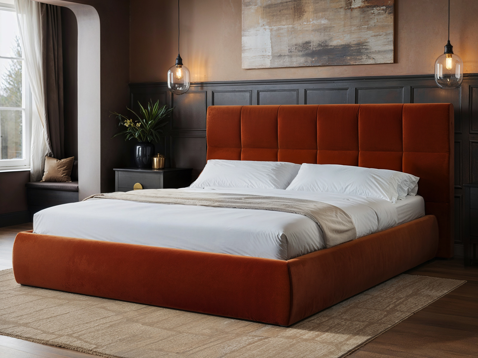Solace+Co Mika Ottoman Bed Burnt Orange Velvet The Solace+Co Mika Ottoman Bed is beautifully upholstered in sumptuous burnt orange velvet. Designed to be both stylish and practical, this bed brings warmth and sophistication to any space while offering a smart storage solution. Key Features: Luxurious Velvet Upholstery Sumptuous burnt orange velvet adds warmth and sophistication Stylish Square Panel Headboard A geometric, modern design that creates a bold statement Spacious Ottoman Storage Easy-lift base reveals hidden storage for bedding and essentials Versatile Sizing Options Available in Double and King sizes to fit different bedroom layouts Contemporary Elegance A chic, upholstered design that complements both modern and traditional d cor Dimensions: Double: L208.5 cm x W170 cm x H108 cm Kingsize: L218.5 cm x W185 cm x H108 cm