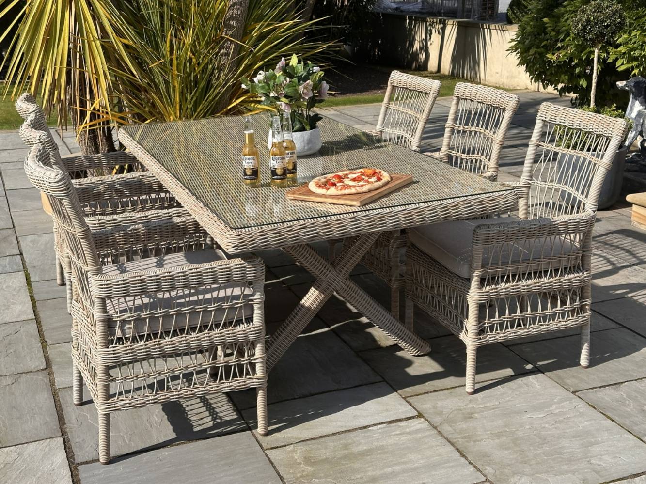 Solace+Co Provence Collection Outdoor 6 Seater Dining Set The Solace+Co Provence Collection Outdoor 6 Seater Dining Set is the ideal blend style and all-weather durability. Featuring a strong yet lightweight powder-coated aluminium frame and an authentic-looking 5mm round HDPE wicker weave, this elegant set is built for outdoor living. The generously cushioned seats, made from grade 5 Olefin fabric, provide lasting comfort and resist fading, moisture, and mildew – perfect for relaxed outdoor dining from spring through to autumn. Key Features: Seats Up to 6 People – Ideal for family meals or entertaining guests 5mm Round HDPE Wicker – Offers a realistic, natural rattan appearance with lasting durability Powder-Coated Aluminium Frame – Lightweight, rust-resistant, and built to last Grade 5 Olefin Cushions – UV-resistant, quick-drying, breathable, and shower-resistant Removable Cushions – Sponge clean only for easy maintenance 5mm Tempered Glass Tabletop – Adds strength and heat resistance Weatherproof and Rustproof – Suitable for year-round outdoor use Low Maintenance – Clean with mild soapy water and a soft brush Provence Collection – Coordinates with matching accessories for a cohesive outdoor look Specifications: Set Weight: 90kg Dining Chair (each): 8kg Dining Table: 42kg Materials: HDPE wicker, powder-coated aluminium, tempered glass, Olefin fabric Seating Capacity: 6 people Cushion Type: Grade 5 Olefin shower-resistant and UV-resistant Finish: Natural-look rattan with matching cushions