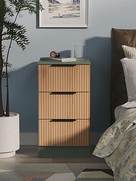SWIFT Lane Ready Assembled 3 Drawer Bedside Table in Green Please note: the drawer fronts on this product are finished with a smooth to the touch melamine which has a pattern of vertical lines designed to give the furniture a slatted-effect appearance. This 3 drawer bedside cabinet is practical, stylish and arrives ready assembled so you can enjoy it right away. Combining both simple elegance with modern styling, this new range comes with a striking slatted-effect front which is actually smooth to the touch thanks to the melamine finish. Contrasting black metal handles complete the contemporary look, while smooth metal runners ensure drawers can be opened and closed with a minimum of friction and noise, even when they’re full. All SWIFT’s furniture is made in the United Kingdom, to the highest quality. It is delivered direct to your location of choice by one of their two man delivery teams, and comes full assembled (although legs may be removed to prevent damage in transit). Please remember to measure your available space before ordering. Dimensions: Height 69, Width 37, Depth 40 cm Assembly: Ready Assembled Material Content: MFC & MDF Finish Type: Wood Effect Type: Auxiliary Handle Number of Drawers: 3 Height 69 x Width 37 x Depth 40cm Scratch Resistant Finish Made in the UK Slatt Effect Front Finish Sleek Metal Handles Metal Drawer Runners Search ‘Swift Lane’ for matching items